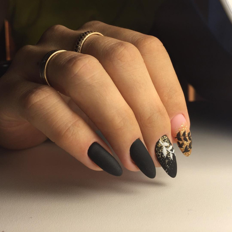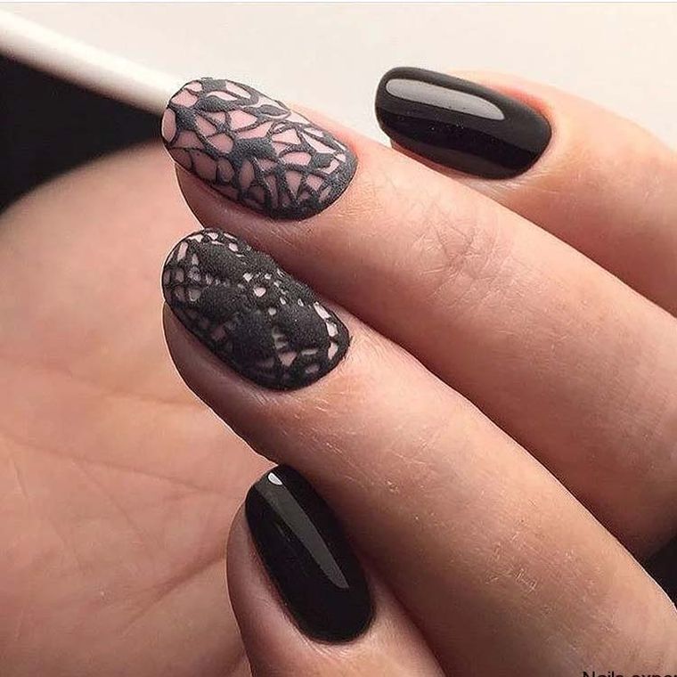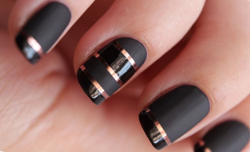 Чёрный маникюр с матовым эффектом придаст ноготкам изящности, утончённости. Чтобы такой маникюр смотрелся ещё красивее, его обычно дополняют глянцевым лаком чёрного цвета. Можно некоторые ноготки покрыть глянцем, а некоторые матовым лаком – выйдет очень оригинальный дизайн.