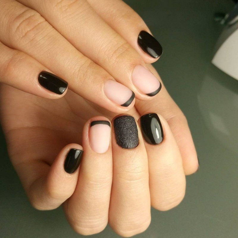 Красиво будет выглядеть чёрный французский маникюр с матовым ноготком и глянцевым краешком.