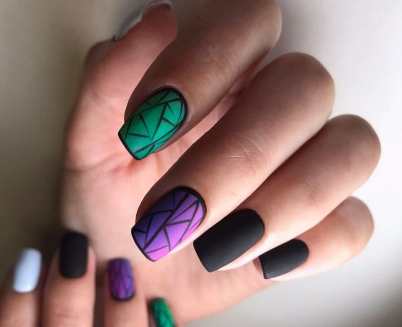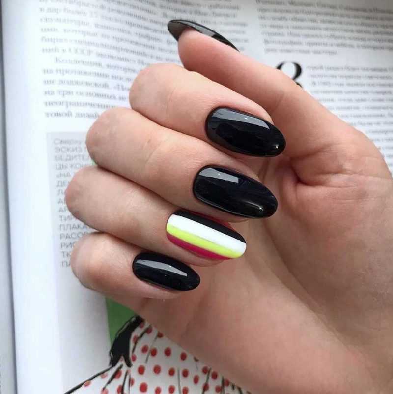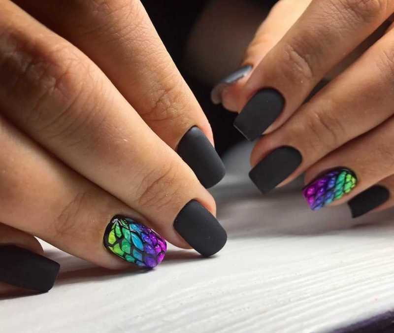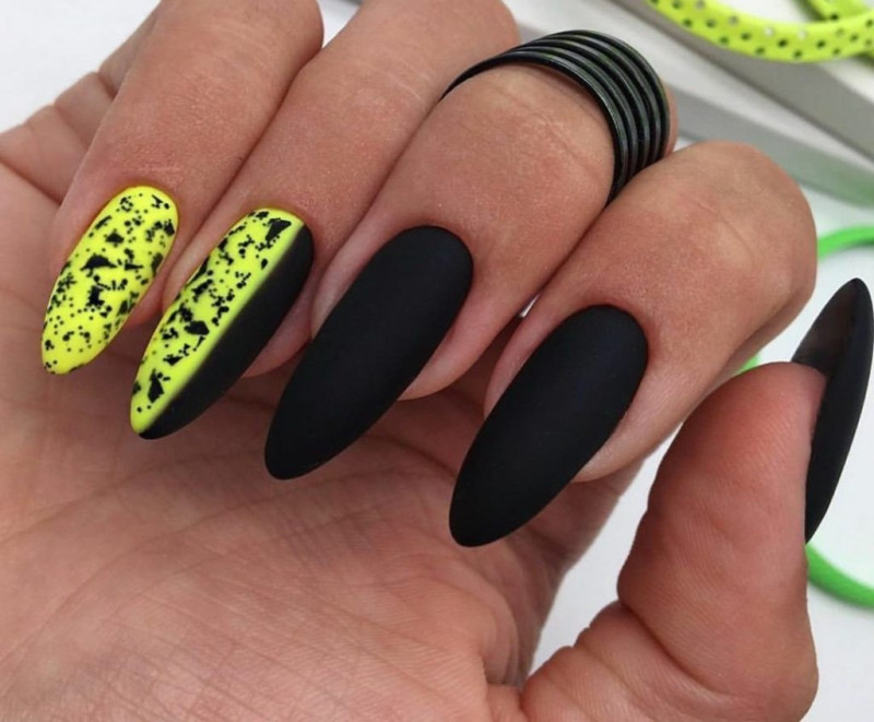 Неоновые оттенки прекрасно дополняют черный матовый лак, создавая контрастный и яркий маникюр