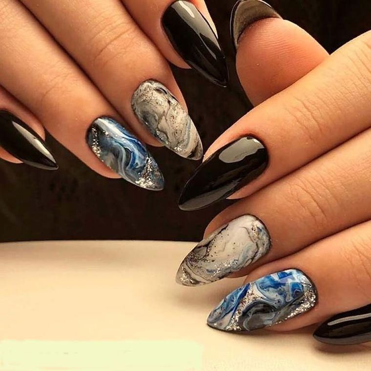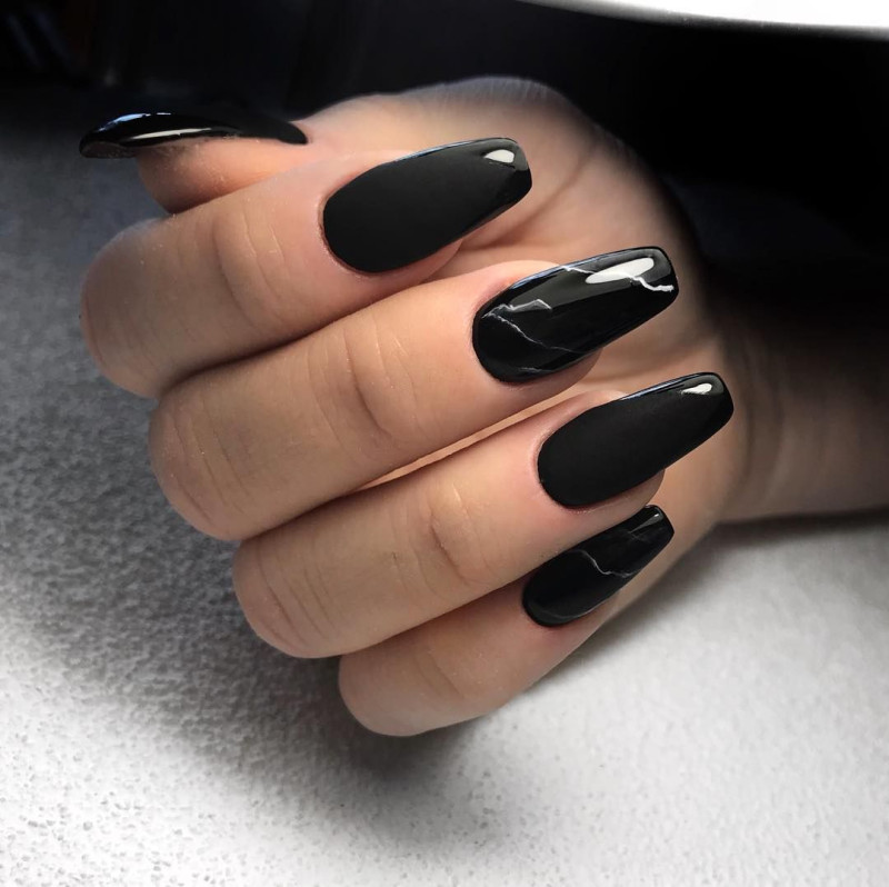 Мраморный дизайн ногтей появился относительно недавно, но сумел запасть в душу многим девушкам. В черном цвете принт выглядит не менее интересно, чем в светлых оттенках.