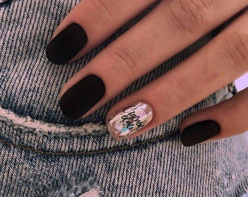 Мотивирующие или забавные надписи также станут трендом предстоящего сезона. На черном гель-лаке хорошо будет смотреться текст белого цвета. Также подойдут светло-голубой, нежно-розовый и нюдовые оттенки.
