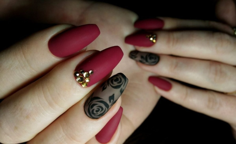 Для создания торжественного образа прекрасным выбором будут бордовые и винные оттенки. Попробуйте сочетать такой маникюр с блеском, черным, белый и зеленым цветом.