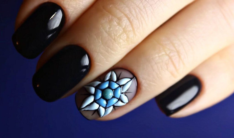 - Идеальный вариант с помощью сочетания техник (это может быть цветок из структурной пасты, узоры рядом из фольги или золотистого лака, а также несколько страз).