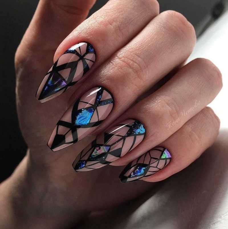 - С помощью темного покрытия, любого светлого оттенка и скотча можно сделать уникальный и неповторимый дизайн черного маникюра 2019 (для этого нужно нанести основной цвет и наклеить скотч в виде геометрических фигур, где оставшееся место будет закрашено иным оттенком).