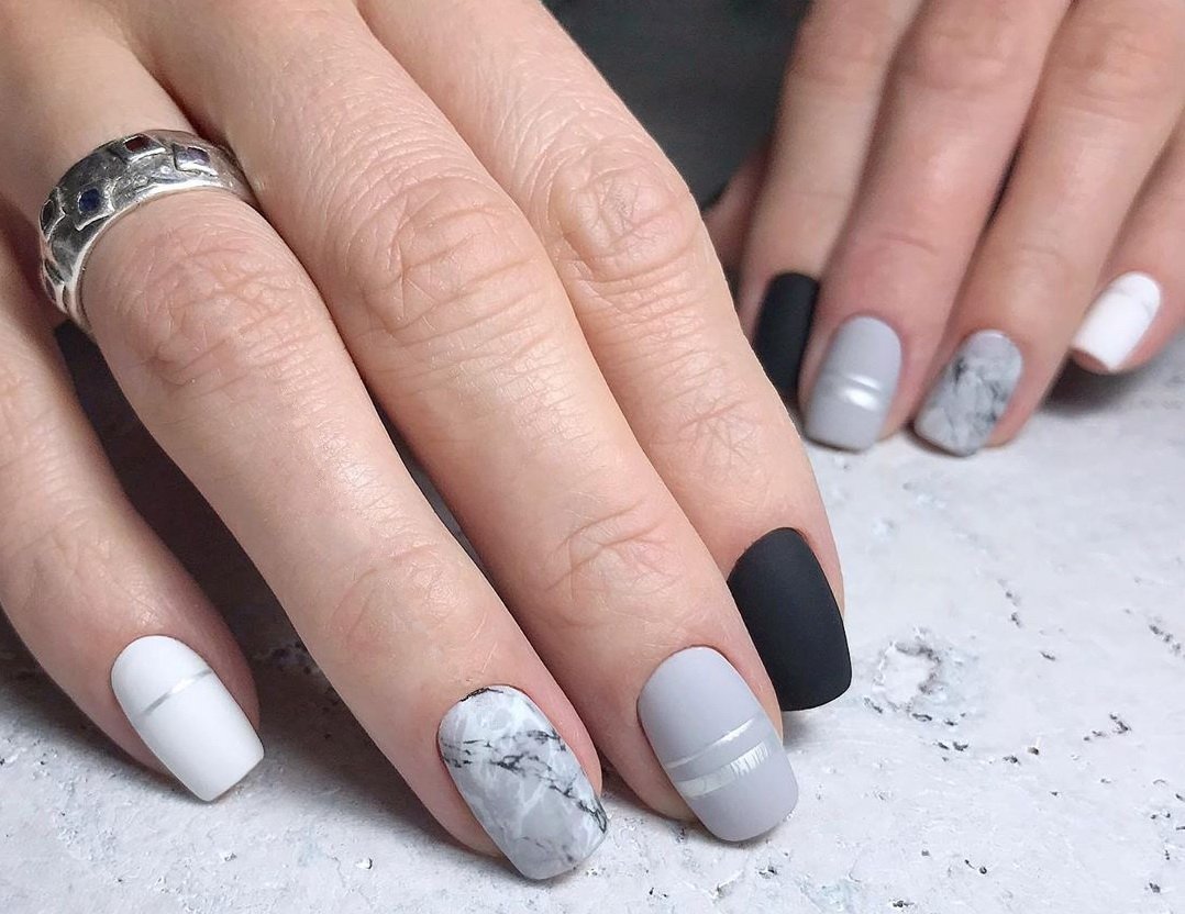 Сочетание черного и серого цветов создает элегантный и стильный маникюр. Вы можете использовать разные оттенки серого для создания градиента или сочетать их в блоки.