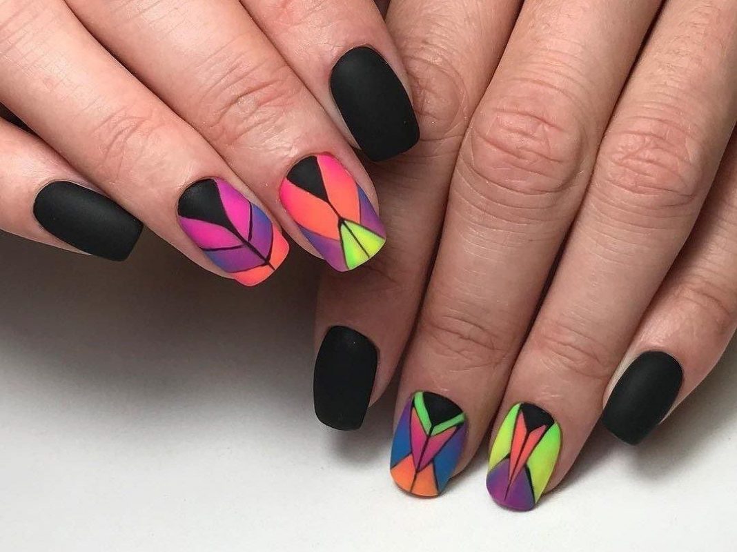 Неоновые оттенки прекрасно дополняют черный матовый лак, создавая контрастный и яркий маникюр