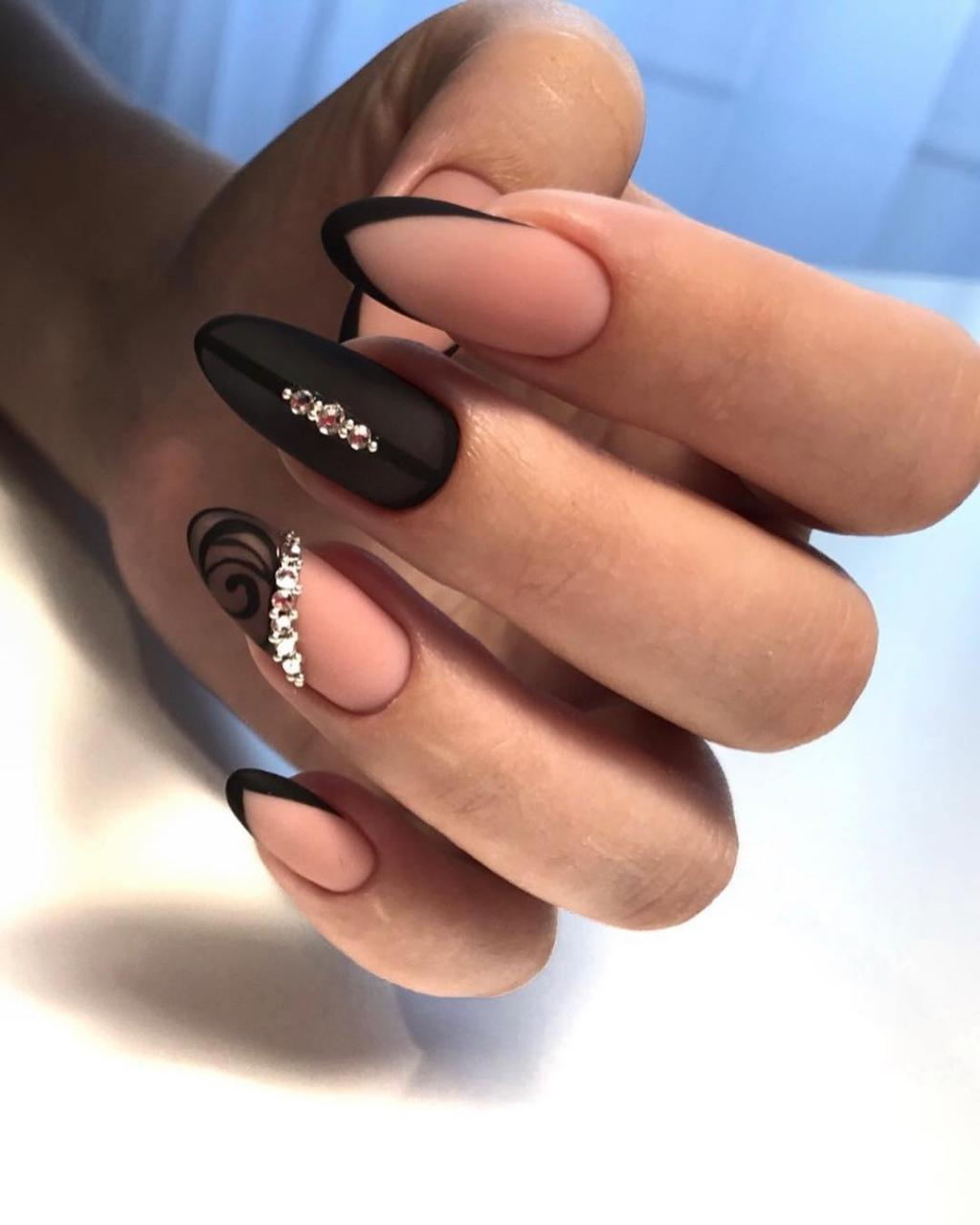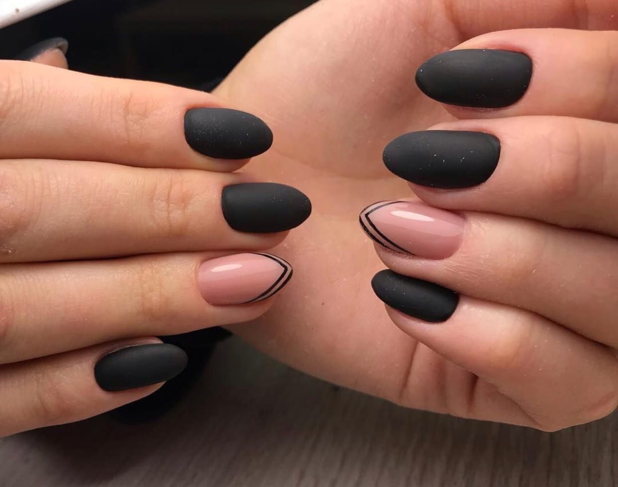 Нежные оттенки нюд прекрасно сочетаются с черным матовым лаком. Это добавит нежности и романтичности вашему маникюру.