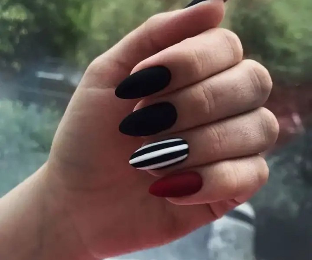 Сочетание красного и черного цветов – это беспроигрышный вариант для создания стильного и сексуального маникюра. Черный матовый лак будет контрастировать с ярким красным.