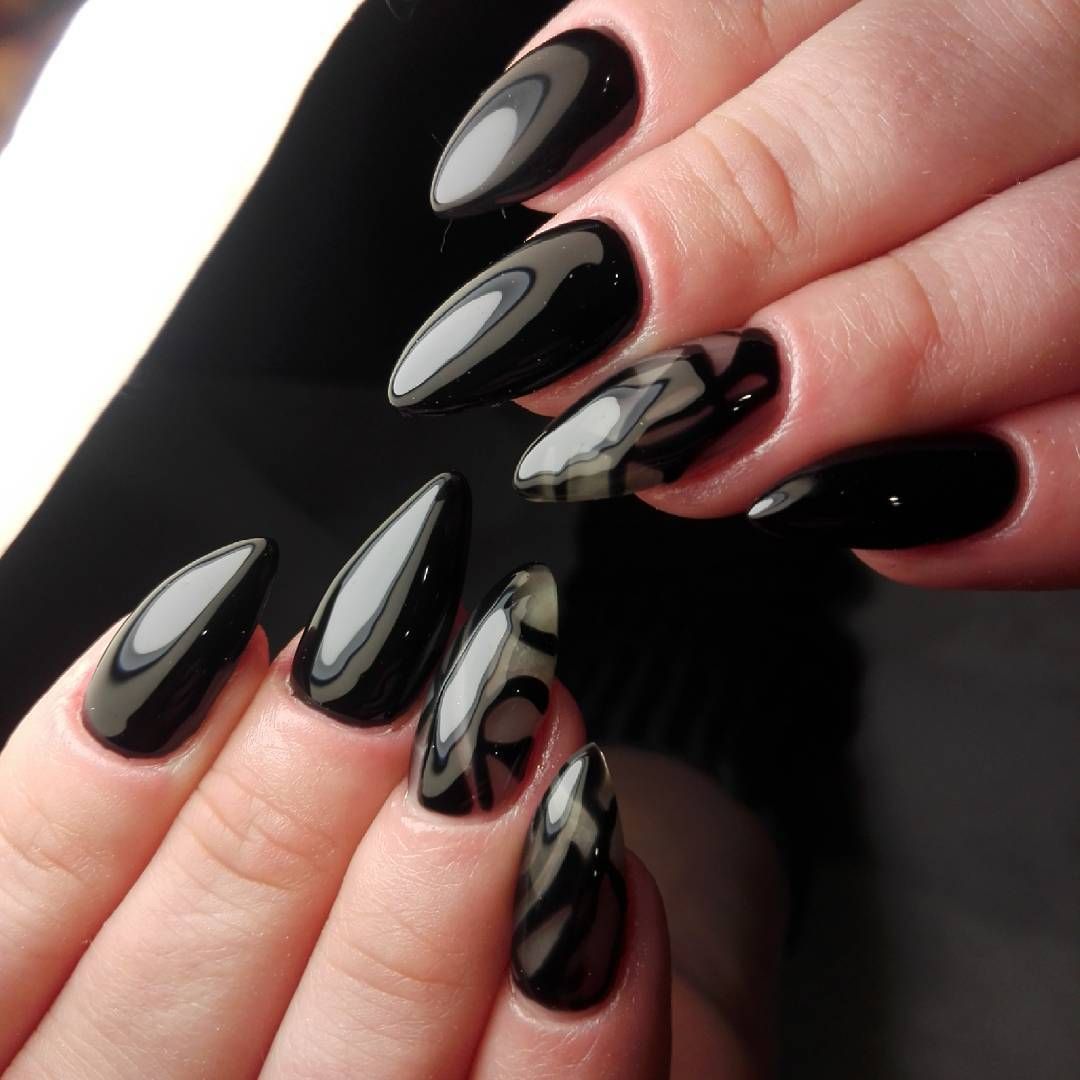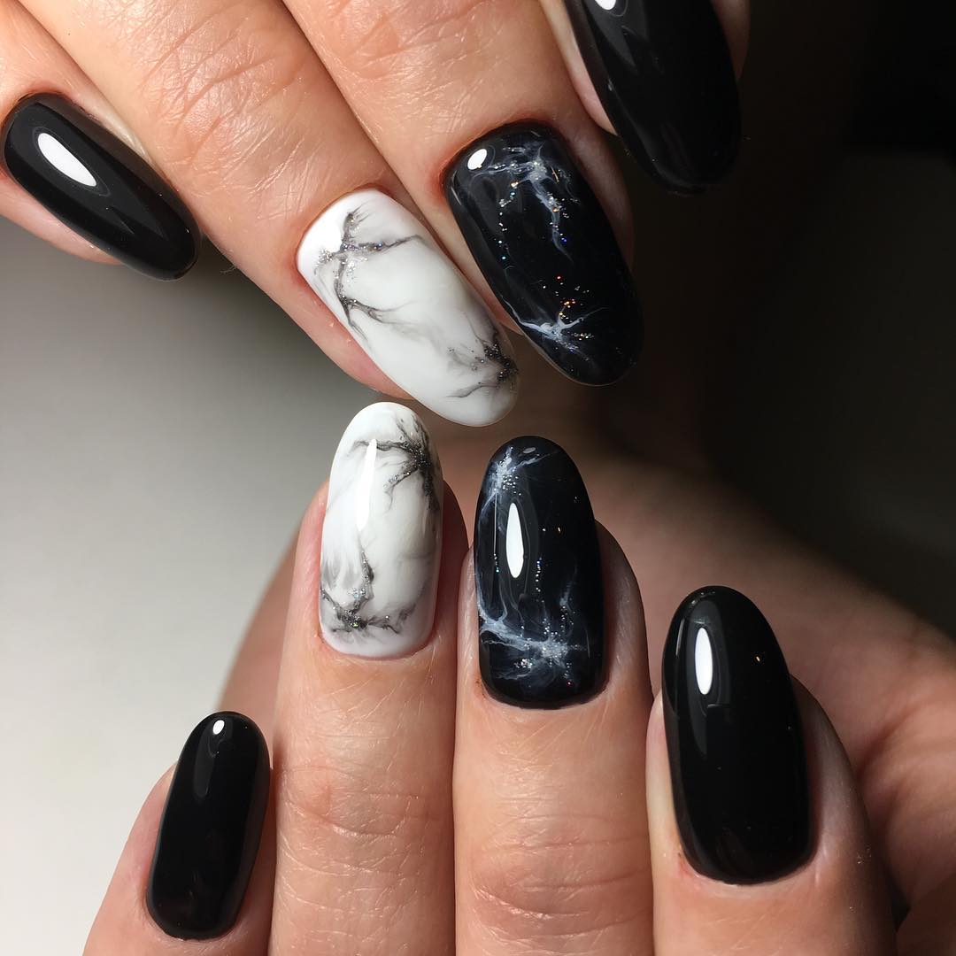 Мраморный дизайн ногтей появился относительно недавно, но сумел запасть в душу многим девушкам. В черном цвете принт выглядит не менее интересно, чем в светлых оттенках.