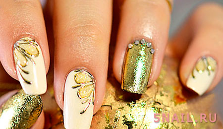 Интересное решение, способное выгодно подчеркнуть всю прелесть женского образа – это рисунки в сочетании с блестящим декором. И здесь нежное мерцание фольги – вне конкуренции. Ею дополняют: