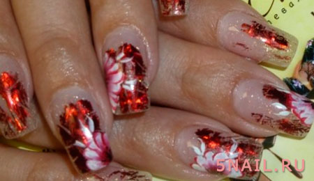Отрывная фольга представляет собой небольшой рулон, от которого в хаотичном порядке отрывается небольшой кусочек материала. Больше подходит для наращенных ногтей с аквариумным дизайном. На натуральных же ногтях держится не слишком длительное время и сложно наносится. В аква-дизайне отрывная фольга кладется на первый конструирующий липкий слой, затем покрывается остальными слоями. Эту процедуру можно проделать и с лаком, но ногти получаться слишком толстыми, и маникюр продержится не долго. Хотя на один вечер вполне хватит. На базовое покрытие для маникюра выкладываются кусочки фольги в желаемом порядке, затем покрываются прозрачным лаком и закрепителем. Дополнительно можно нанести роспись.