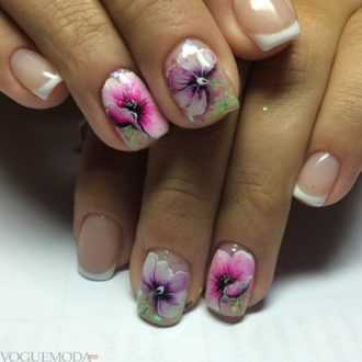 Френч с рисунком на сегодняшний день не менее востребованная разновидность маникюра чем перечисленные ранее. Его особенность заключается в обязательном наличии рисунка на ногтях. При этом, остальная часть ногтей, на которой рисунка не будет, должна также покрываться лаком. Здесь рисунок играет основное, но не единственное значение.
