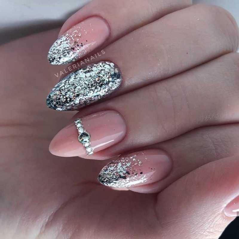Прекрасный вариант для заостренных ногтей нежные нюдовые цвета. Если хочется более праздничный лук, то смело добавляйте блестки, строгую геометрию. Нежности придадут: розовый, лавандовый, молочные цвета. Незаменим в этом плане и всеми любимый французский маникюр.