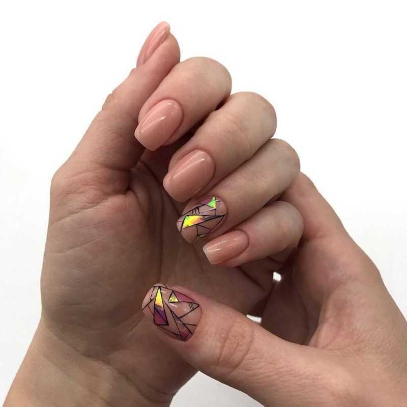 Битое стекло — интересная и привлекательная конструкция. Это практически никого не оставляет равнодушным. Этот дизайн может быть бесконечно милым или ярким и смелым. Все зависит от выбранного цвета фона. Битое стекло на телесном и черном — два совершенно разных маникюра.