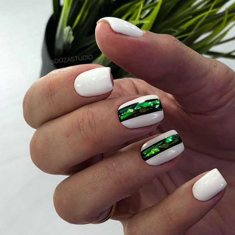 Пожалуй, зелёный является наиболее популярным оттенком при создании кошачьего глаза. А всё потому, что он максимально приближен к основной идее этого маникюра. Ведь согласитесь, когда мы представляем себе кошачий взгляд, то в первую очередь в нашем воображении всплывает изумрудно-зеленый цвет. Именно поэтому модницы так охотно воплощают его на своих ногтях. Зеленый маникюр кошачий глаз выглядит очень притягательно и завораживающе