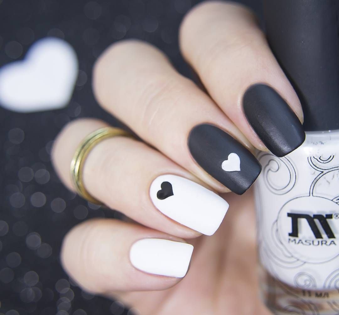 Для любителей всего оригинального и необычного подойдет маникюр с сердечками в черных тонах. Рисунок можно изобразить на одном ногте, а оставшиеся покрыть блестками, пудрой и т.д.