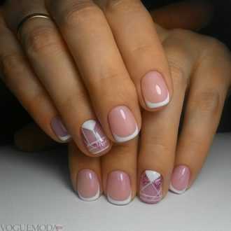 Нежный маникюр одинаково хорошо смотрится на ногтях любой формы. Дизайн может быть любым: нежный френч, яркий нейл-арт, использование стразов, блесток, фольги, элегантный белый или нежный розовый. Все зависит только от вашего настроения и назначения маникюра.