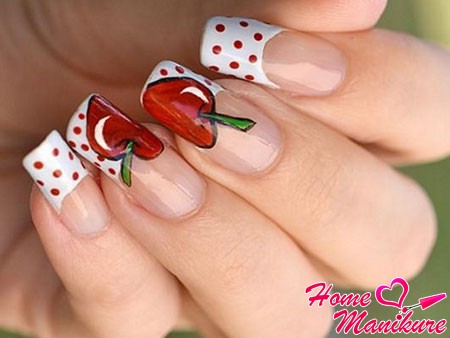 - «Вишневый френч». Вы можете выполнить очень незаурядный дизайн, который не даст заскучать. В таком маникюре ногтевая пластина оформляется прозрачным лаком или же покрытием с небольшим блеском, а на свободной части ногтя рисуются вишни. Они могут доходить почти до середины ногтя, если того требует дизайн. Такой маникюр будет одинаково хорошо смотреться и на длинных, и на коротких ногтях.