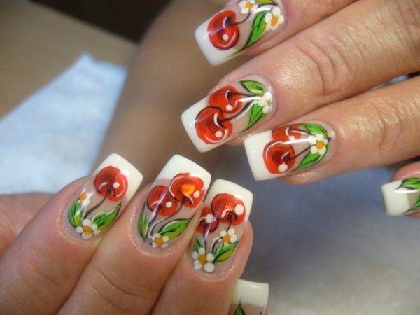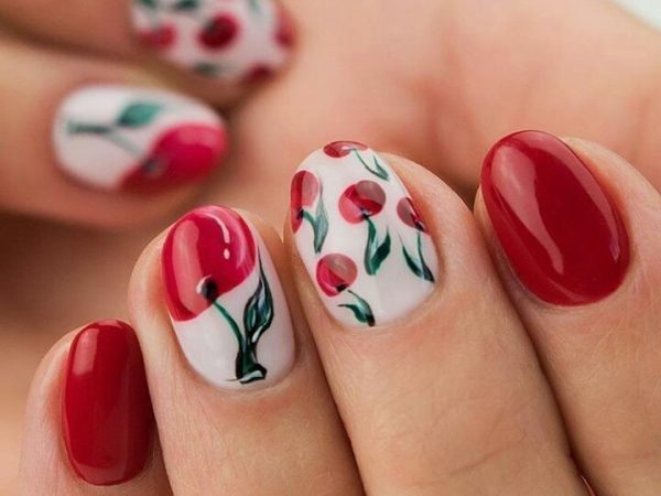 Флористические мотивы очень популярны в ногтевом искусстве. Летом делают маникюр с вишенками. Его несложно выполнить в домашних условиях даже без специальных инструментов, а если использовать гель-лак, то изображение продержится 3-4 недели.