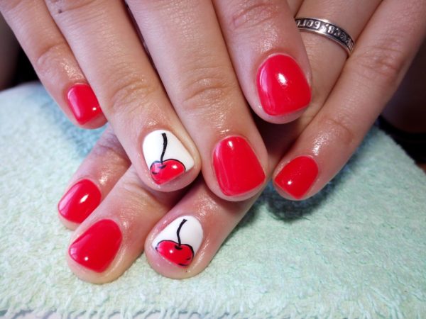 Дизайн ногтей с вишней относят к легкому летнему варианту. Носить его в холода или на работу не очень уместно.