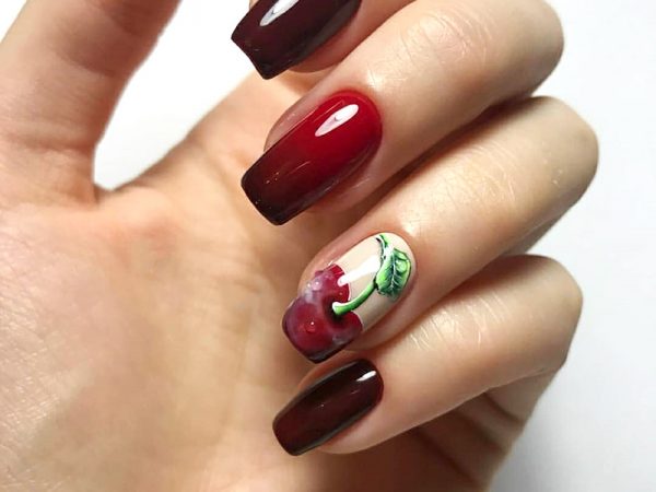 В интернете вы найдете около миллиона самых разных дизайнов и картинок «вишневого» маникюра. При этом глаза просто разбегаются, ведь хочется создать и этот, и тот маникюр. Но не отчаиваетесь, ведь всегда можно скомбинировать несколько идей и получить что-то особенное. Главное — дать волю своей фантазии и позволить в полной мере раскрыться воображению. Вишневый дизайн вы можете выполнять с помощью обычных или же гель-лаков. Конечно же, для более стойкого покрытия стоит использовать второй вариант. Можно выделить следующие интересные идеи: