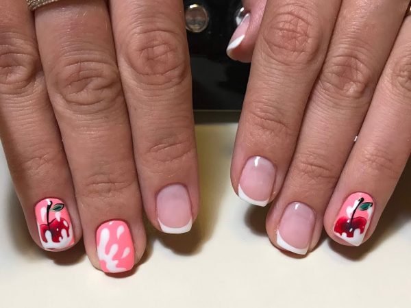 - Классический или цветной френч без труда дополнят сочные вишенки. Сам по себе французский маникюр не является скучным, но сделать его более «живым» и притягательным помогут летние ягодки в ярком оформлении. Для большей выразительности их можно прорисовать с помощью золотой, черной или белой акриловой краски (или лаков). Кроме того, зеленые листики также подойдут очень даже хорошо.