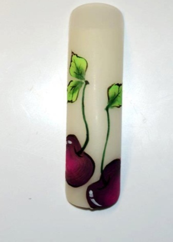 Получится слепить небольшие объемные вишенки и листья к ним. Каждый элемент сразу просушивают в лампе. Потом наносят и другой декор.
