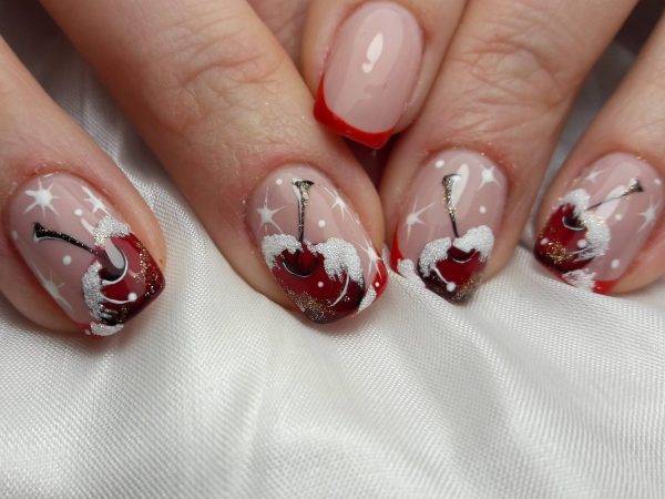 Вовсе не обязательно рисовать ягоды на каждом ногте. В последнее время стал популярен дизайн только двух ногтей — например, на среднем и безымянном. Другие же красятся в однотонном цвете. Вы можете разнообразить свои вишни с помощью снега, смотреться это будет более чем необычно.