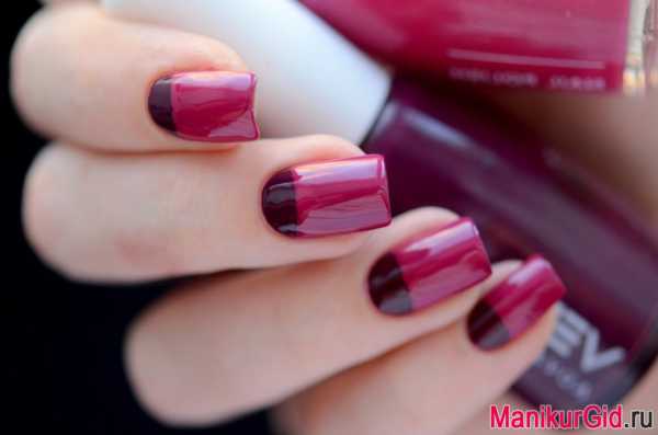 - Выполняя вишневый маникюр с дизайном, с помощью тонкой кисти сильным нажимом растушевать стык оттенков, добиваясь однородного промежуточного цвета. Если кисть начинает полосить, можно вытереть ее о салфетку.