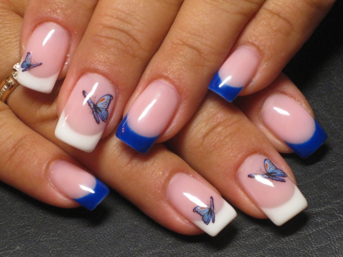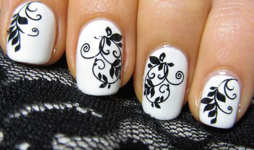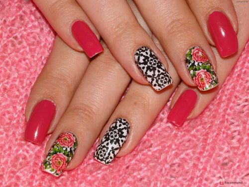 - изображения на прозрачной основе. Разные тематические рисунки (цветы, кружево, веточки, надписи и т.д.) переносятся на подложку определенного цвета и частично декорируют ногтевую пластину. Могут использоваться во французском маникюре;