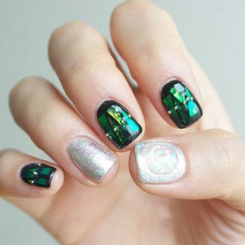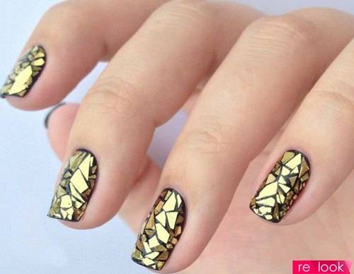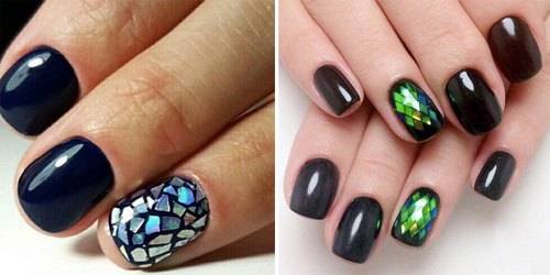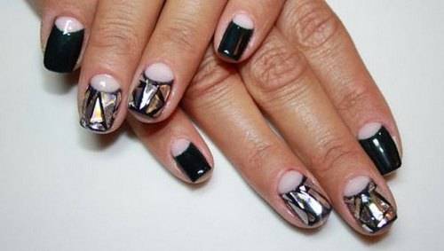 В домашних условиях, конечно же, проще всего пользоваться прозрачным лаком с добавлением блестящих кусочков неправильной формы, которые в процессе маникюра выкладываются на поверхности ногтей в произвольном порядке. Фото маникюра со слюдой, представленные ниже, показывают насколько оригинальным и привлекательным он может быть. Поэтому не стоит бояться экспериментов при выполнении маникюра. Немного настойчивости и усидчивости и все обязательно получится.