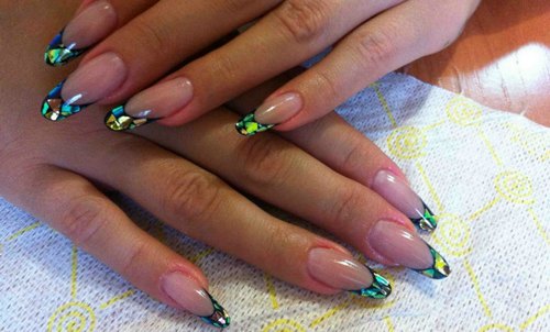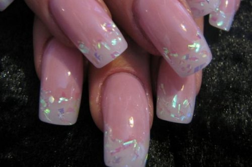 Существует огромное количество вариантов создания конструкции ногтей со слюдой, которые выполняются самодельно. Один из таких – французский маникюр. Он выглядит нежно и изящно. Кусочки слюды применяются как на длинные, так и на короткие ногти.