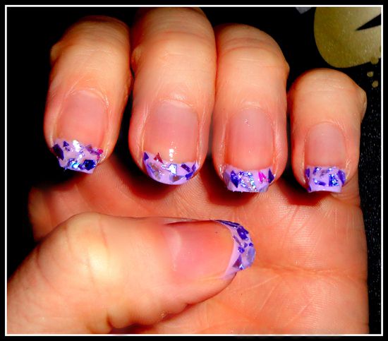 Нарисуйте на кончике ногтя полоску из прозрачного или цветного лака (у меня сиреневый лак) и сразу же приступите к нанесению слюды. Лучше всего это делать дотсом – маникюрным инструментом с круглым металлическим концом. К слову, его я заказала в каталоге Avon. Конечно, дотс от Avon далеко не самый лучший и удобный, но все же он лучше зубочистки. Хотя если дотса нет, можно воспользоваться и ею.