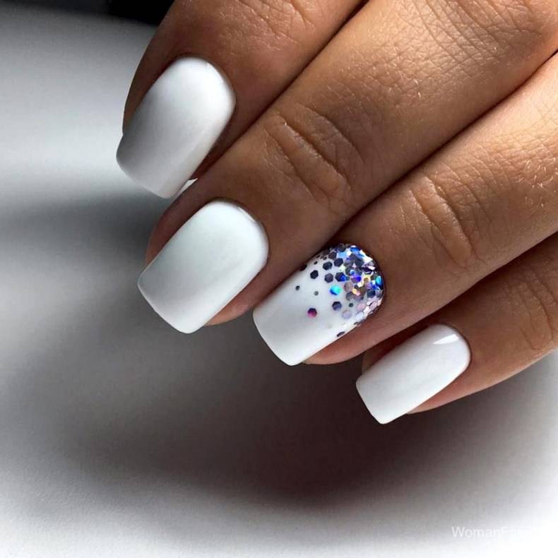 Независимо от выбранного варианта, однотонный маникюр прекрасно смотрится с блестящим декором. Поскольку он буквально добавляет ему яркости. Что касается расположения, то такие детали преимущественно размещают в прикорневой зоне на нескольких ноготках. Это дает возможность сделать акцент в маникюре, но при этом не слишком вызывающий. Для лучшего закрепления используйте прозрачный топ.