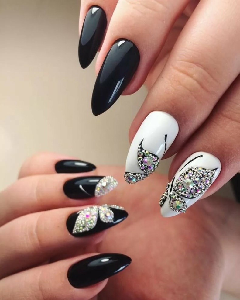 - Черный маникюр со стразами смотрится интересно и оригинально. Яркая идея: пауки на черном фоне, брюхо которых обозначено блестящим камнем.