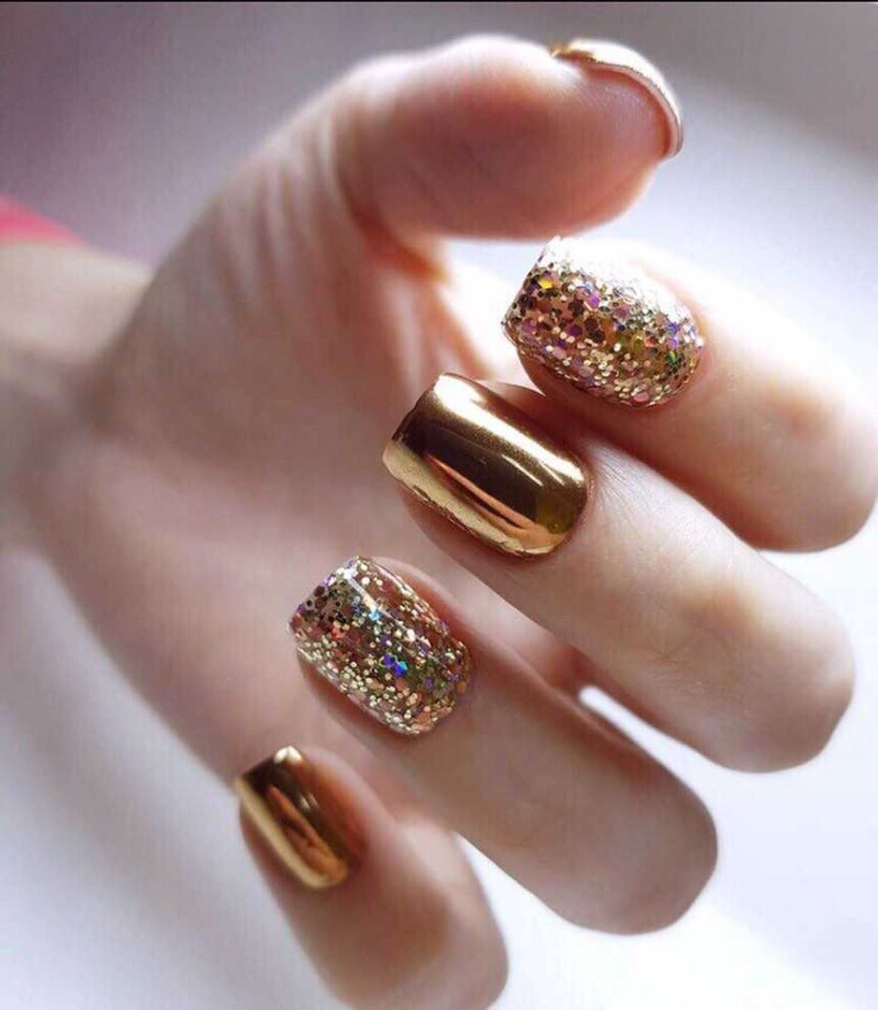 Женщины всегда проявляли особую любовь к блеску. Именно поэтому наряду с классическими яркими, но однотонными покрытиями для ногтей появились лаки с блёстками. В основу просто добавляли кусочки металлизированной фольги. Эта тенденция прослеживалась на рубеже 80-90-х гг XX века. Такой дизайн часто выглядел безвкусно, вызывающе.