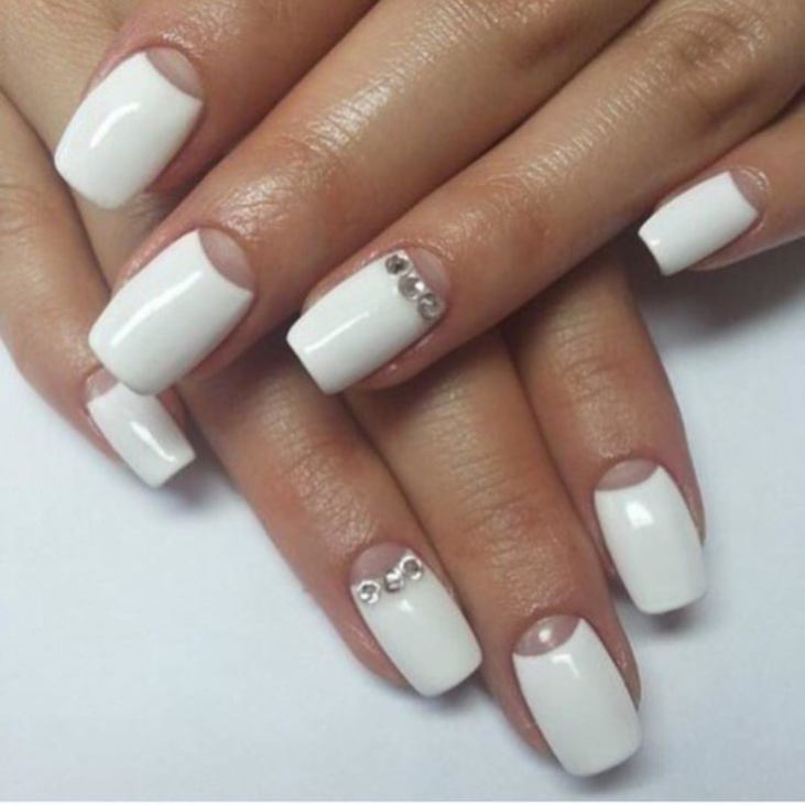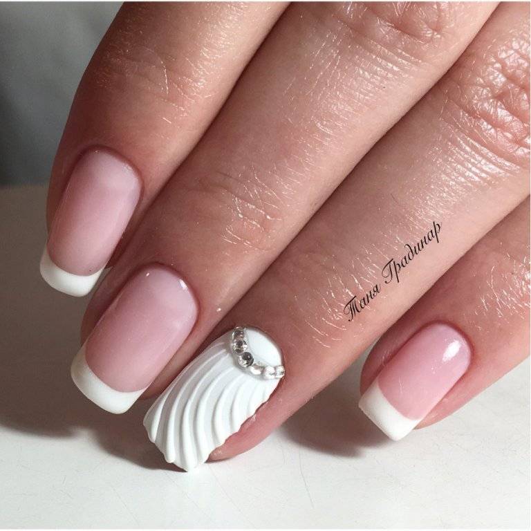 Белый френч со стразами выглядит ярко, но не вызывающе. Кристаллики можно разместить на белом ободке или обозначить ими линию улыбки. Также выигрышно смотрятся стразы на безымянных пальцах.