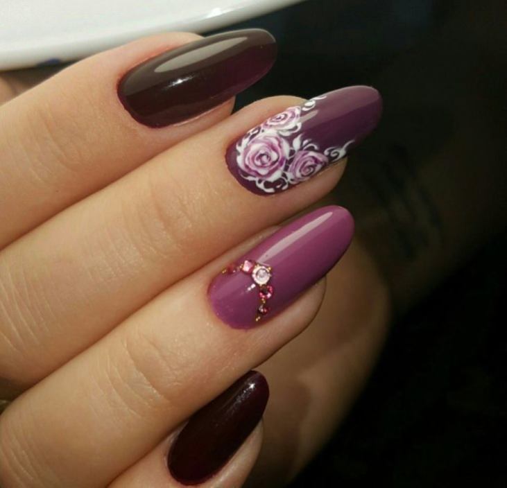 Мастера Нейл-Арта применяют сочетание матового и глянцевого оттенков, что превращает обычный маникюр в искусство. А стразы, выложенные на матовом фоне, отлично отражают свет и переливаются гранями.