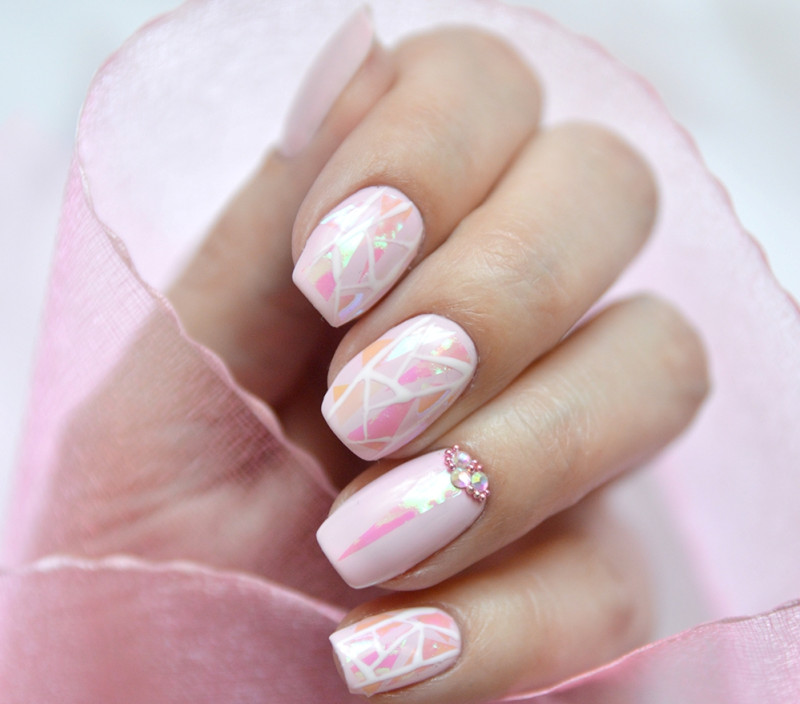 Прозрачные участки на ногтевом ложе дополняют светлые оттенки лака нотками загадочности и необычайной лёгкостью. Это могут быть как полоски, волны, зигзаги или разнообразные фигуры, так и полностью прозрачная основа, на которой располагаются цветные изображения. Стразы в таком оформлении приемлемо размещать непосредственно на прозрачных участках, либо по границе сочетания покрытий.