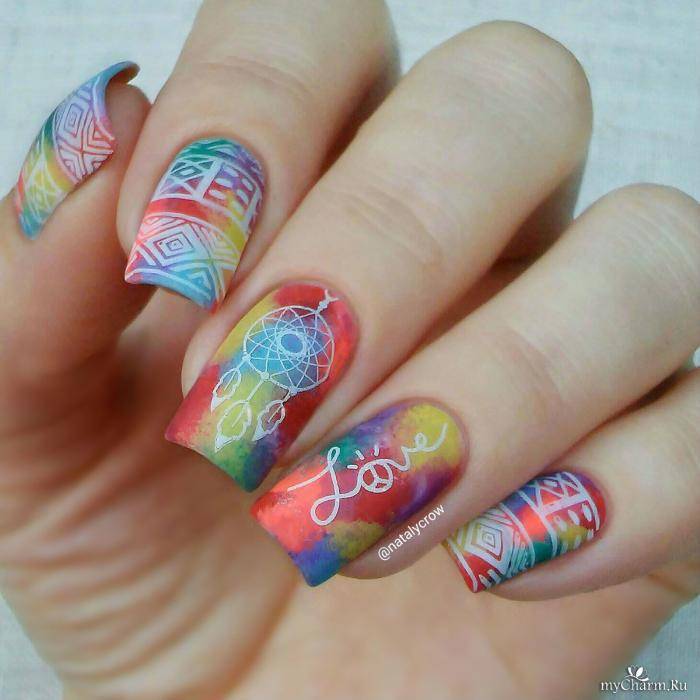 Свободный дизайн с рисунками, которые взяты с цветастых рубах и плетёных браслетов. Маникюр поражает своей яркостью, сочностью красок, поэтом он идеально подойдёт девушкам летом.