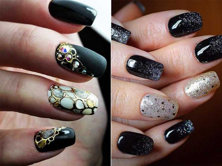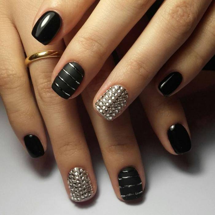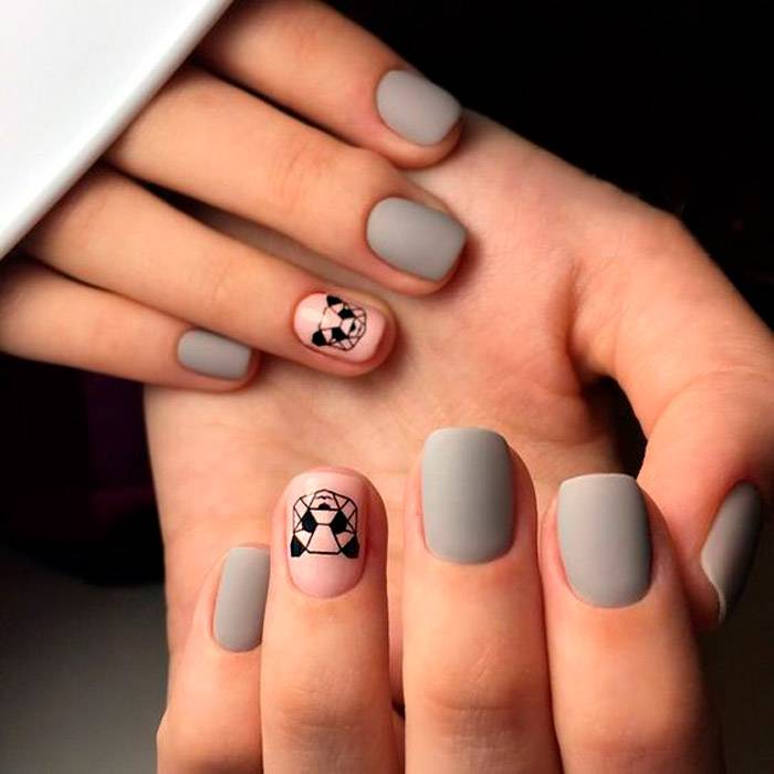 Актуально будет добавить рисунки геометрических фигур, птичек или белый горошек. Невероятно красивый дизайн можно получить, если покрыть все ногти матовым лаком, а на безымянный палец и мизинец нанести блестки. Такое оформление ноготков сегодня можно часто увидеть на фото голливудских звезд.