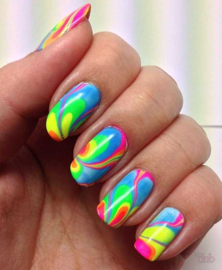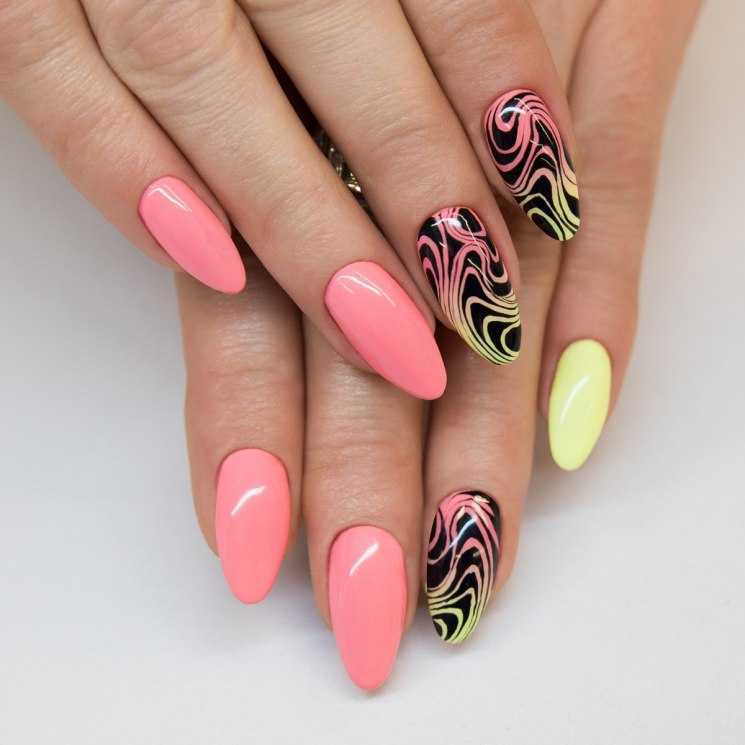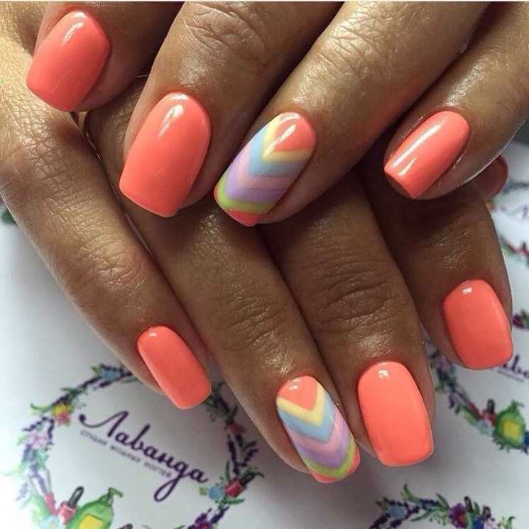 Такой маникюр выбирают самые яркие модницы, которые хотят быть в центре внимания. Дизайн моментально бросается в глаза, это один из самых крутых вариантов на лето, который вошел в новинки сезона. С ним лучше всего сочетаются надписи, геометрия и градиент. Пробуйте экспериментировать и воплощать в реальность свои самые неординарные идеи.