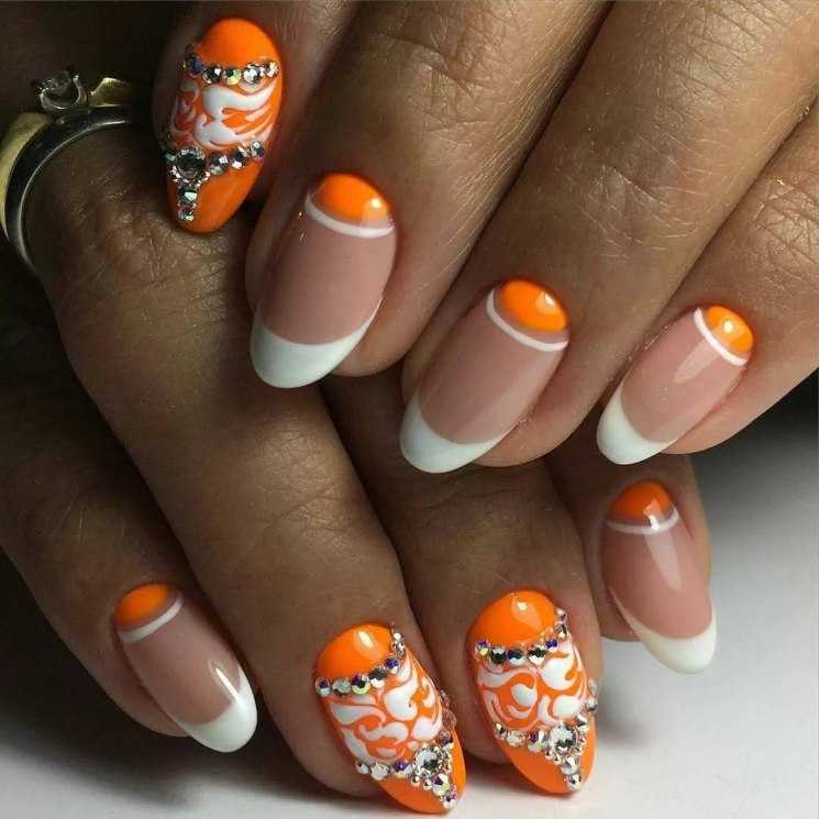 Если вы хотите сделать элегантный маникюр, покройте ноготки матовым топом. Нейл-мастера рекомендуют среднюю длину и квадратную форму. Еще один тренд 2022 года — оранжевый френч. Покройте линию «улыбки» этим оттенком лака и ваш маникюр станет выглядеть совершенно по-новому. Для праздничного дизайна можно добавить блестки или стразы. С ними любой маникюр будет смотреться шикарно.
