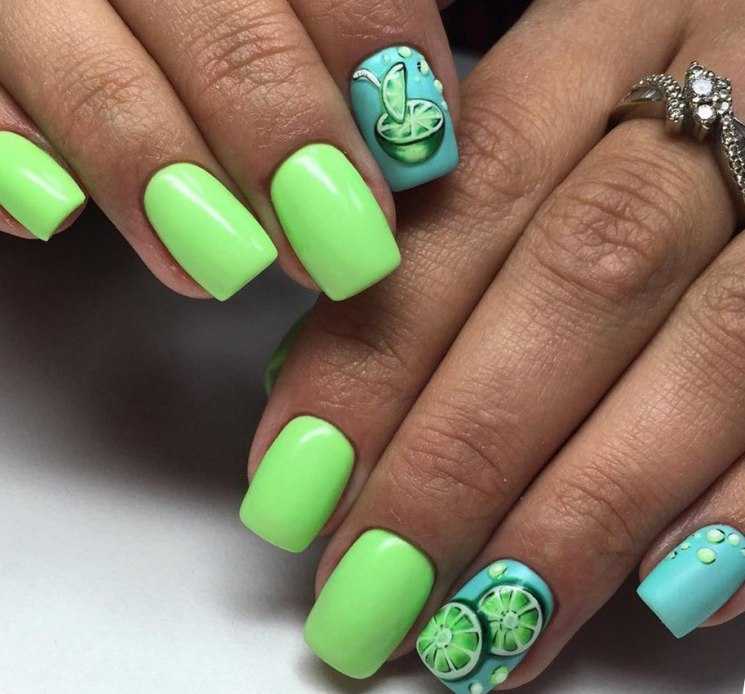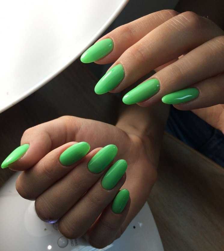 Даже простой и незатейливый образ преобразится с ярко-зеленым маникюром. Красиво будут выглядеть на зеленом фоне рисунки контрастных цветов.