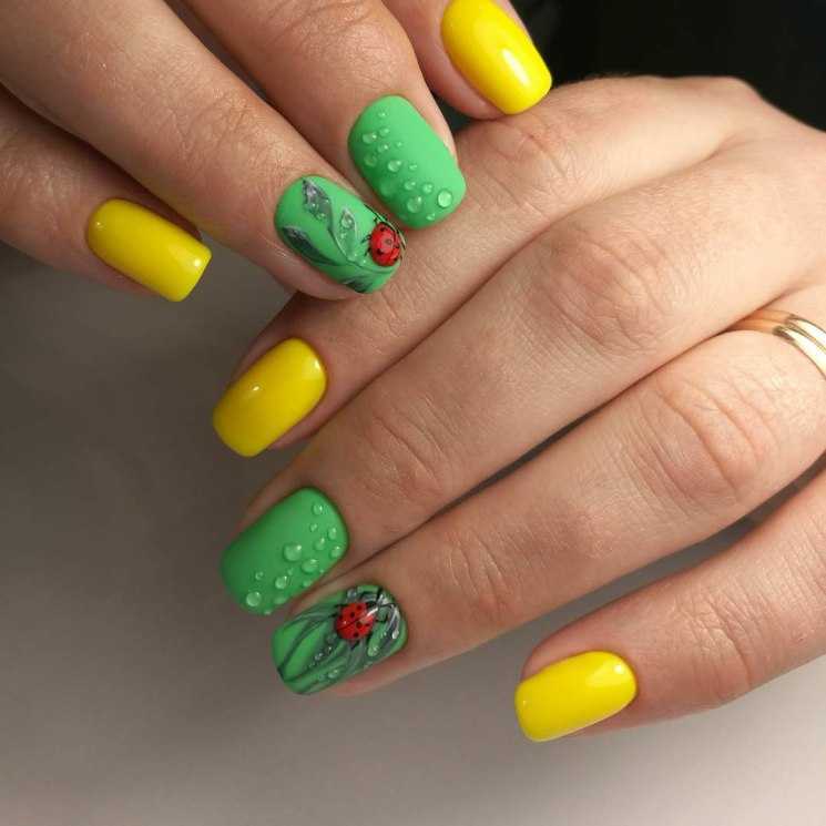 Этот цвет очень стильно смотрится в сочетании с желтым гель-лаком. Маникюр становится солнечным и точно сможет поднять настроение своей обладательнице. Необычный дизайн можно создать при помощи животного принта. В моде рисунки, имитирующие кожу зебры и коровы, можно добавить иллюстрации в виде змей и драконов — будет выглядеть новомодно и свежо.