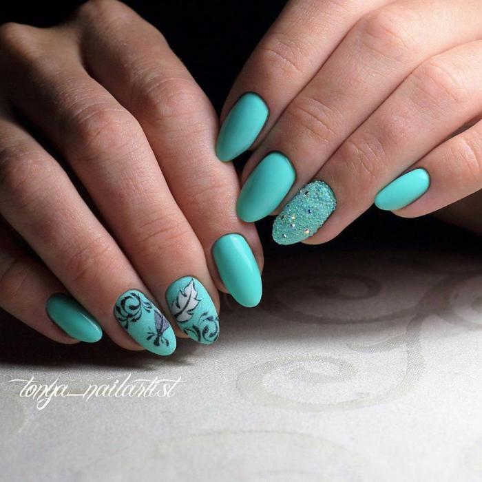 Этот маникюр любят из-за его нежности, трогательности. Если говорим о маникюре в цвете Тиффани, то сразу вспоминается бирюзовый цвет, банты и кружево.