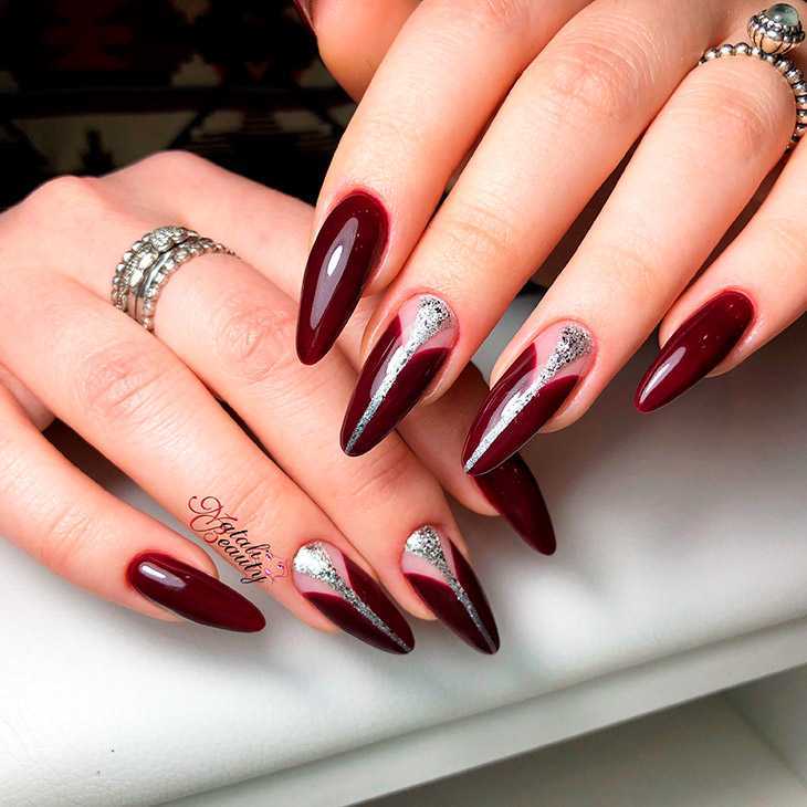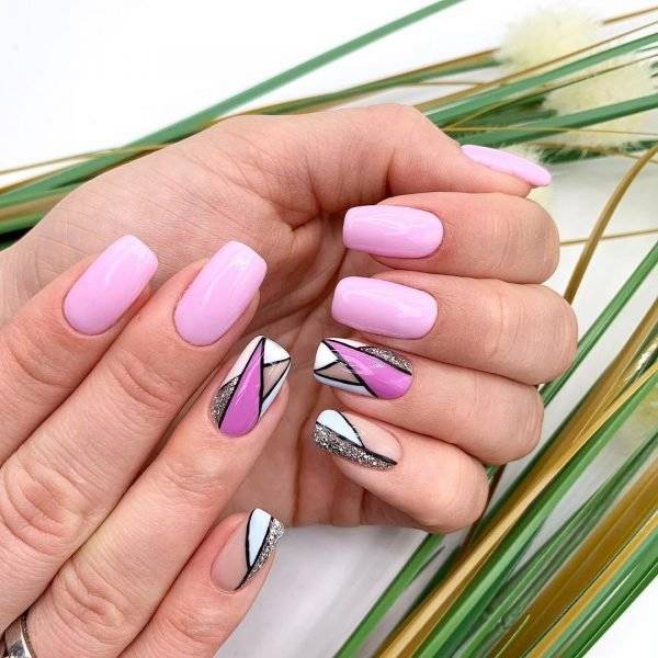 Модный лунный маникюр с закрашенной серебряным цветом «луной» тоже будет очень кстати. Не менее привлекательно выглядит чередование глянцевого и матового покрытия одного цвета – розового, голубого, и мраморный принт с тонкими прожилками и вкраплениями блесток. В 2023-2024 предпочтительна геометрия – тонкие линии на одном-двух ногтях, собирающиеся в замысловатый узор – ромб или треугольник.