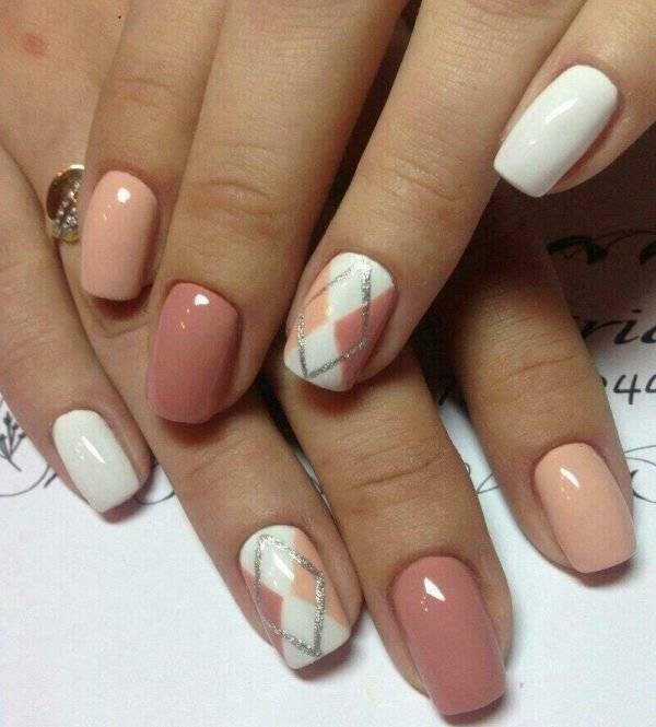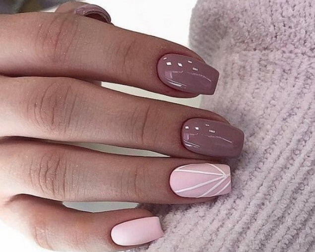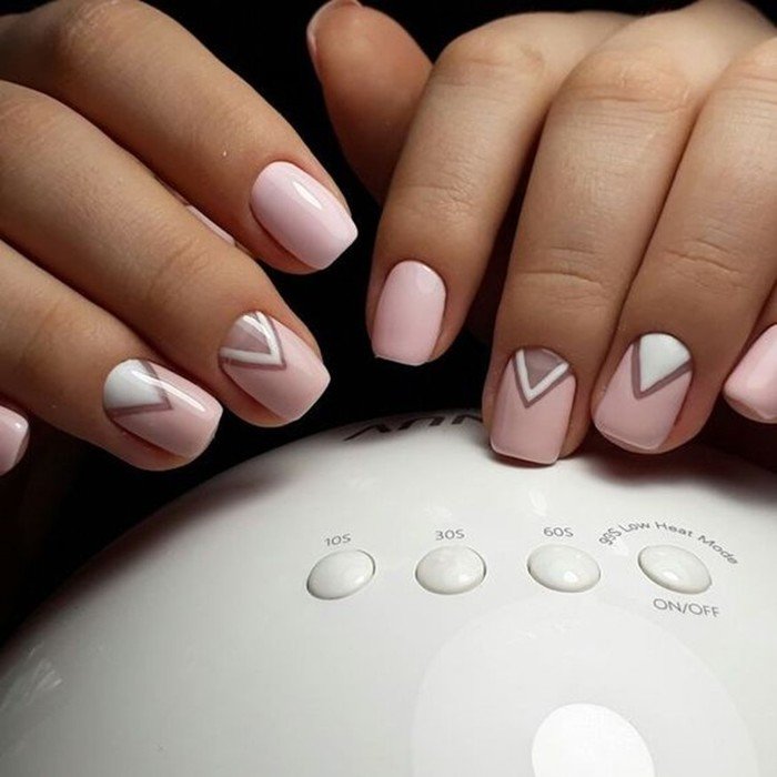 Матовые серо-голубые, голубые, бежевые или пудровые цвета и пара легких геометрических рисунков на разных ногтях – вот и лаконичный, стильный деловой нейл-арт.