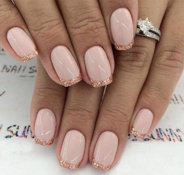 Френч или лунный маникюр, выполненный глиттером или блестками в сдержанной палитре. Такой дизайн подойдет при нестрогом дресс-коде, и может трансформировать дневной стиль в вечерний при смене наряда.
