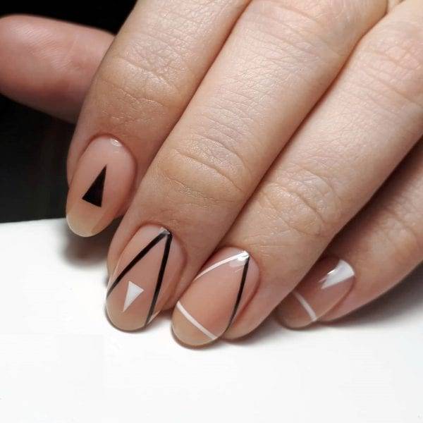 Стильная геометрия. Универсальный и абсолютно непритязательный дизайн, который легко впишется в деловой аутфит. Ноготки можно украшать, как одним геометрическим элементом, расположенным ровно посередине пластины, так и сразу несколькими фигурами, которые в сочетании образуют целый узор. Что до цветовой гаммы, подложку в данном случае следует делать светлой, например, в оттенке слоновой кости, а вот сами рисунки уже оформлять в чёрном или тёмно-сером цвете.